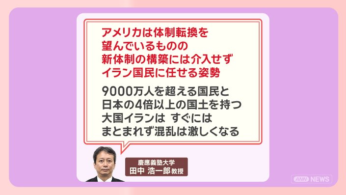 「アメリカは体制転換を望んでいるものの、新体制の構築には介入せず、イラン国民に任せる姿勢。9000万人を超える国民と日本の4倍以上の国土を持つ大国イランは、すぐにはまとまれず、混乱は激しくなる」