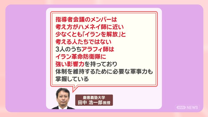 「指導者会議のメンバーは考え方がハメネイ師に近い。少なくとも『イランを解放』と考える人たちではない。3人のうちアラフィ師は、イラン革命防衛隊に強い影響力を持っており、体制を維持するために必要な軍事力も掌握している」