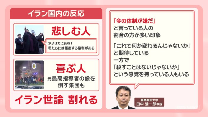 「アメリカに死を!私たちには報復する権利がある」と悲しむ人もいる一方、元最高指導者の像を倒す集団が現れるなど、喜ぶ人々も出てきていて、イランの世論は割れています。