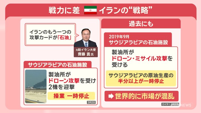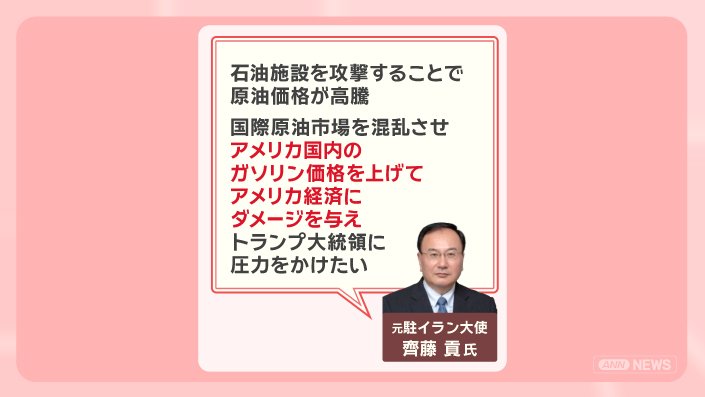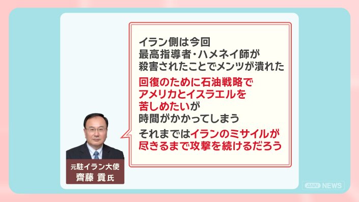 「イラン側は今回、最高指導者・ハメネイ師が 殺害されたことでメンツが潰れた。回復のために石油戦略でアメリカとイスラエルを苦しめたいが、時間がかかってしまう。それまではイランのミサイルが尽きるまで攻撃を続けるだろう」