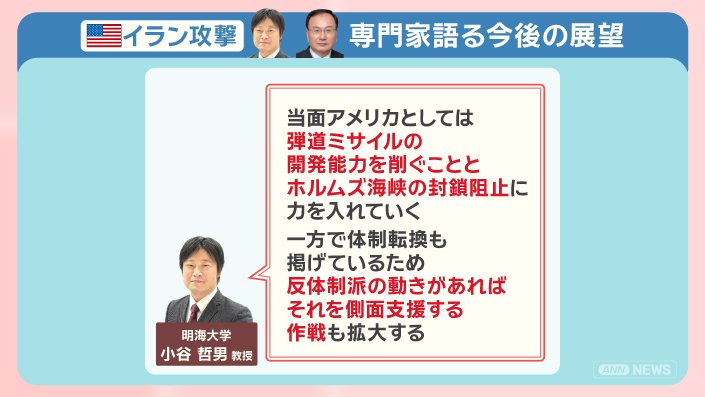 「当面、アメリカとしては 弾道ミサイルの開発能力を削ぐことと、ホルムズ海峡の封鎖阻止に力を入れていく。一方で、体制転換も掲げているため、反体制派の動きがあればそれを側面支援する作戦も拡大する」