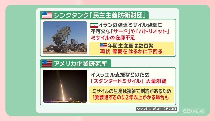イランの弾道ミサイル迎撃に不可欠な『サード』や『パトリオット』ミサイルの在庫が不足しているということです。
