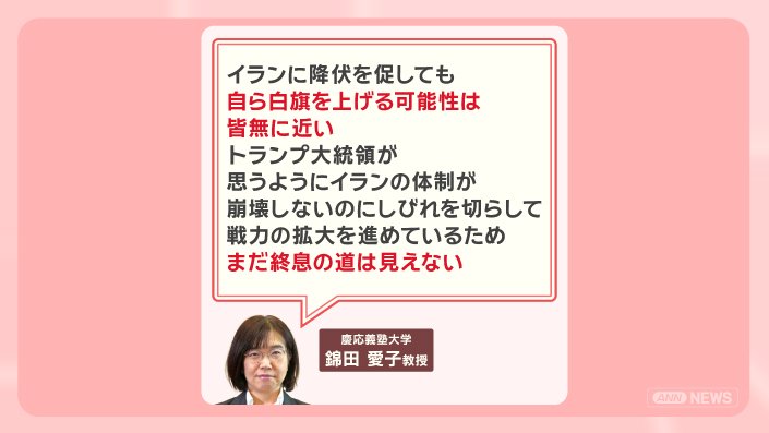 「イランに降伏を促しても、自ら白旗を上げる可能性は皆無に近い。トランプ大統領が思うようにイランの体制が崩壊しないのにしびれを切らして戦力の拡大を進めているため、まだ終息の道は見えない」
