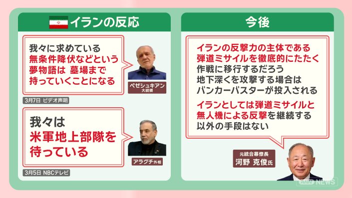 「イランの反撃力の主体である弾道ミサイルを徹底的にたたく作戦に移行するだろう。地下深くを攻撃する場合はバンカーバスターが投入される。イランとしては弾道ミサイルと無人機による反撃を継続する以外の手段はない」