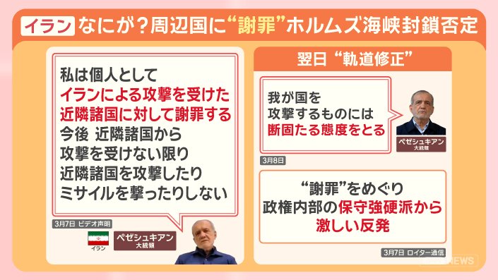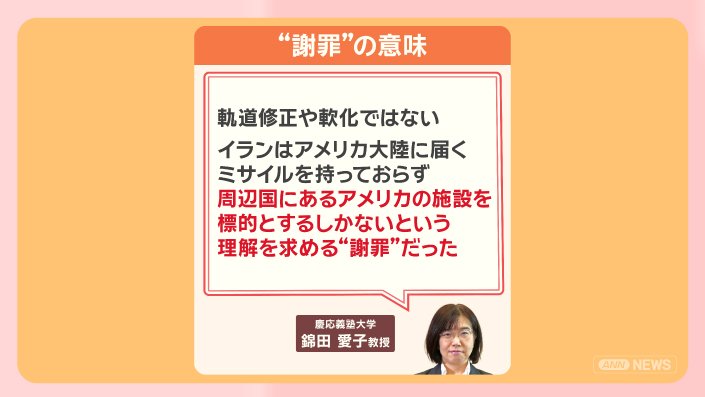 「軌道修正は軟化ではない。イランはアメリカ大陸に届くミサイルを持っておらず、周辺国にあるアメリカの施設を標的とするしかないという理解を求める“謝罪”だった」