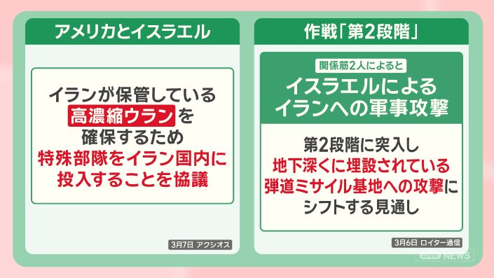 さらにアメリカとイスラエルは、イランが保管している高濃縮ウランを確保するため、特殊部隊をイラン国内に投入することを協議しているといいます。