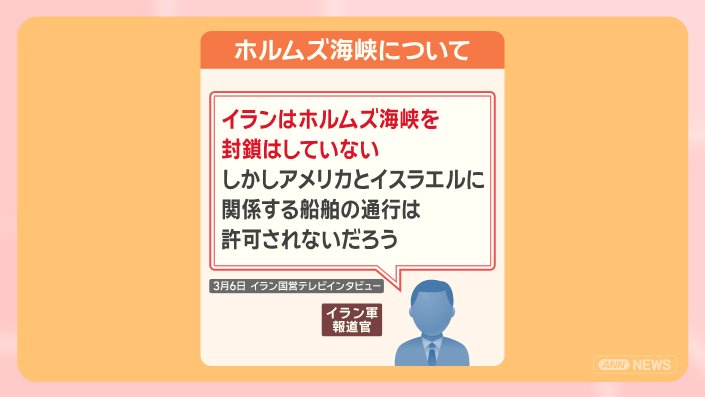 「イランはホルムズ海峡を封鎖はしていない。しかしアメリカとイスラエルに関係する船舶の通行は許可されないだろう」