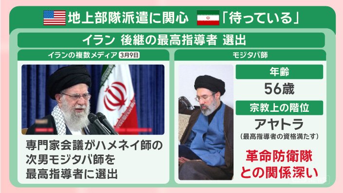 イランの複数メディアは3月9日、専門家会議が殺害されたハメネイ師の後継の最高指導者にハメネイ師の次男、モジダバ師を選出したと報じました。
