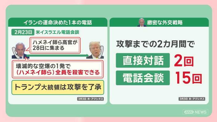 ネタニヤフ首相とトランプ大統領は攻撃が始まるまでの2か月間で、直接対談を2回、電話会談を15回も行っています。