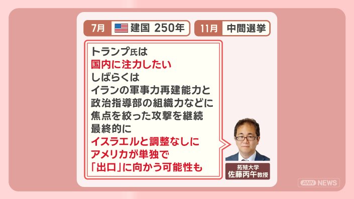 「トランプ氏は、国内に注力したい。しばらくはイランの軍事力再建能力と政治指導部の組織力などに焦点を絞った攻撃を継続するだろう。最終的にイスラエルと調整なしにアメリカが単独で『出口』に向かう可能性」もあるのではないかと指摘します。