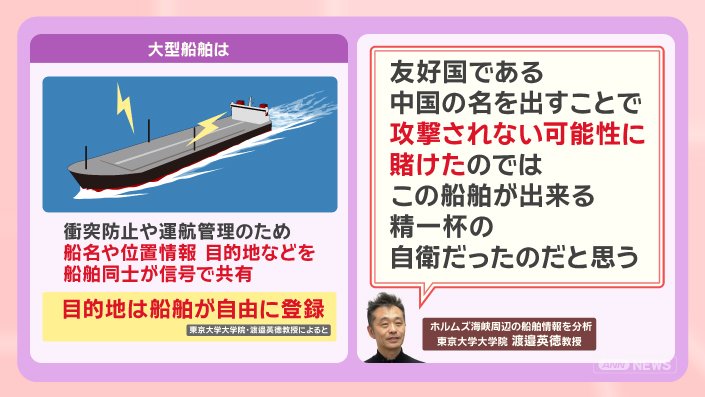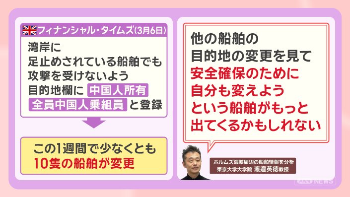 さらに、イギリスのフィナンシャル・タイムズによると、湾岸に足止めされている船舶でも攻撃を受けないように目的地欄に『中国人所有』や『全員中国人乗組員』と登録する船が出てきており、この1週間で少なくとも、10隻の船舶が変更しているということです。