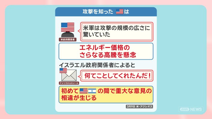 そこには「何てことをしてくれたんだ!」と書いてあったということで、アメリカメディアは攻撃後初めてアメリカとイスラエルの間に重大な意見の相違が生じたと報じています。