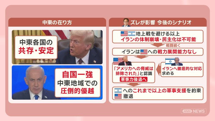 アメリカは「アメリカへの脅威は排除された」と認識、軍事力を後退させようとしますが、イスラエルは、イランへの徹底的な対応を求めます。