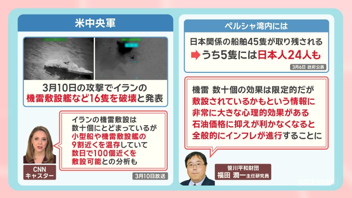 「イランの機雷敷設は数十個にとどまっているが、小型船や機雷敷設艦の9割近くを温存していて、数日で100個近くを敷設可能との分析も」あるとしています。