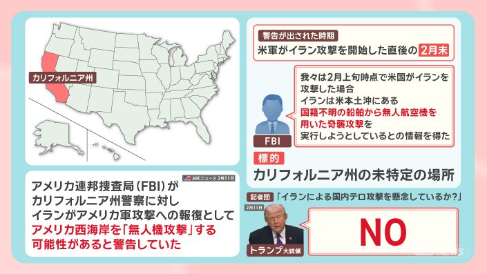 アメリカのABCニュースは3月11日、FBIアメリカ連邦捜査局がカリフォルニア州警察に対し、イランがアメリカ軍攻撃への報復としてアメリカ西海岸を無人機攻撃する可能性があると警告していたと報じました。