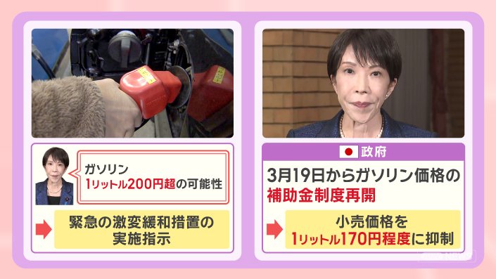 政府は3月19日からガソリン価格を抑える補助金制度を再開し、小売価格を1リットル170円程度に抑制します。