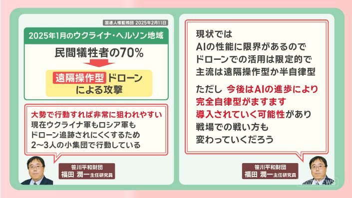 ウクライナ侵攻では、2025年1月のウクライナ・ヘルソン地域では、民間犠牲者の70%が『遠隔操作型』のドローンによる攻撃でした。