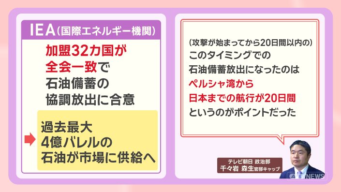 「(攻撃が始まってから20日間以内の)このタイミングでの石油備蓄放出になったのは、ペルシャ湾から日本までの航行が20日間というのがポイントだった」