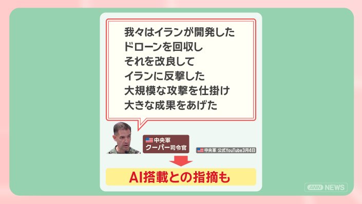「我々はイランが開発したドローンを回収し、それを改良してイランに反撃した。大規模な攻撃を仕掛け、大きな成果をあげた」としていて、ドローンにはAIを搭載しているとの指摘もあります。