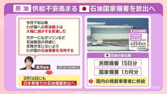 「今月下旬以降、わが国への原油輸入は大幅に減少する見通しだ。万が一にもガソリンなど石油製品の供給に支障が生じないよう、わが国の石油備蓄を活用する」と述べ、3月16日にも、日本単独で石油備蓄を放出する方針を明らかにしました。
