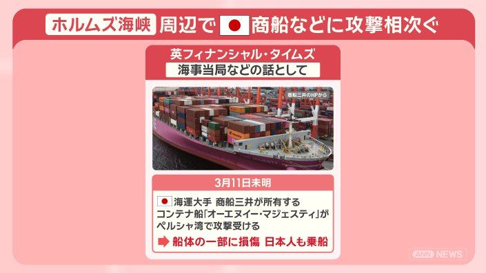 イギリスのフィナンシャル・タイムズによると、海事当局などの話として、3月11日未明、日本の海運大手、商船三井が所有するコンテナ船『オーエヌイー・マジェスティ』が、ペルシャ湾で攻撃を受けたと報じました。