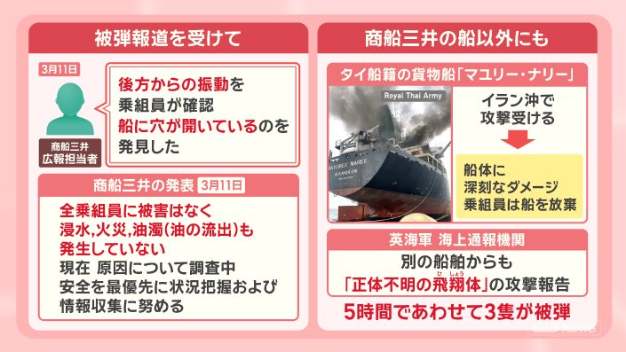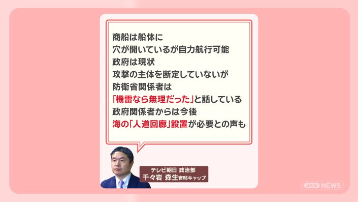 「商船は船体に穴が開いているが、自力航行可能。政府は現状、攻撃の主体を断定していないが、防衛省関係者は『機雷なら無理だった』を話している。政府関係者からは今後、海の『人道回廊』設置が必要との声も」