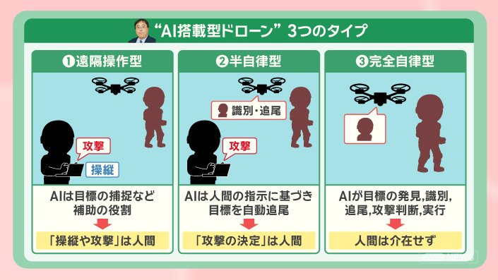 笹川平和財団の福田さんによると“AI搭載型ドローン”には、3つのタイプがあるということです。