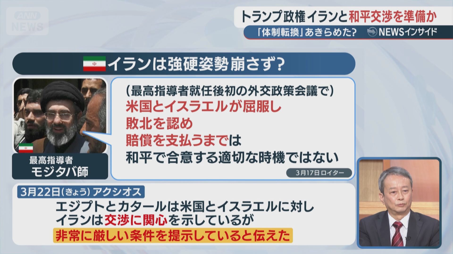 トランプ大統領は3月23日、イランとの「対話」を進めたと主張し、予告していたイランの発電所への攻撃を「5日間」延期した。イランは発電所が攻撃された場合、ホルムズ海峡の完全封鎖に踏み切るとしている。今後の展開が見通せない状況だが、激化する戦闘は新たな段階に突入していた。『読む日曜スクープ』は、双方の深刻な隔たりと合わせて“緊迫した現状”を探る。