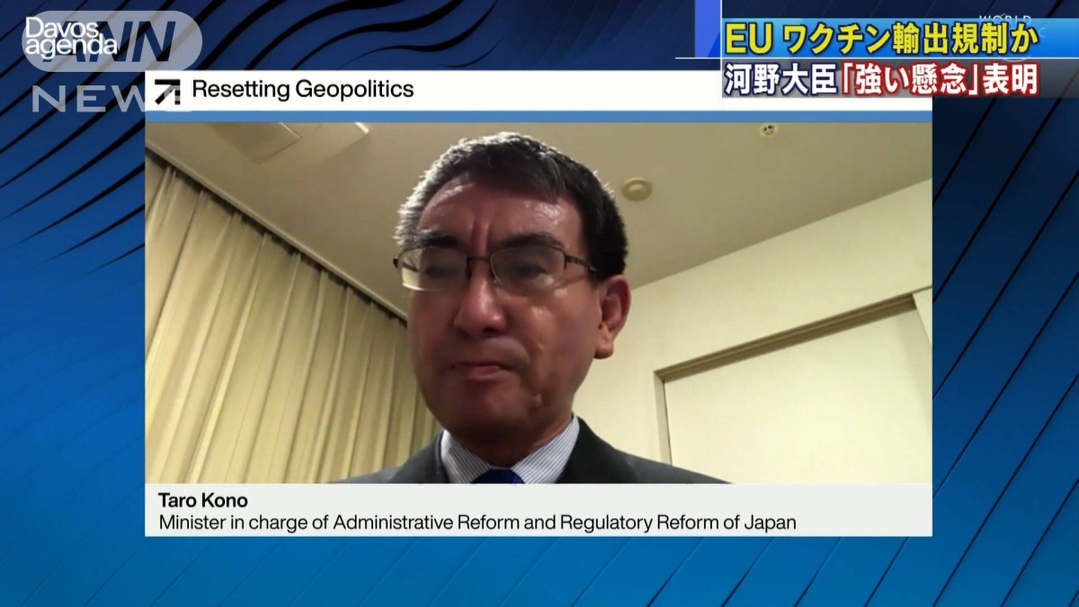 河野規制改革担当大臣は世界経済フォーラム主催のオンライン会合に出席し、新型コロナウイルスのワクチンについてEU(ヨーロッパ連合)が域外への輸出を制限する可能性があると懸念を示しました。