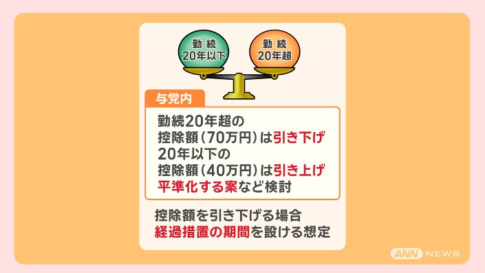 「拙速な見直しはいたしませんが、慎重なうえに適切な見直しをすべき」と、勤続年数の長い人の税制上の優遇を見直す可能性を示唆しました。