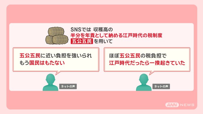 SNSでは、収穫高の半分を年貢として納める江戸時代の税制度、五公五民という言葉を使って、