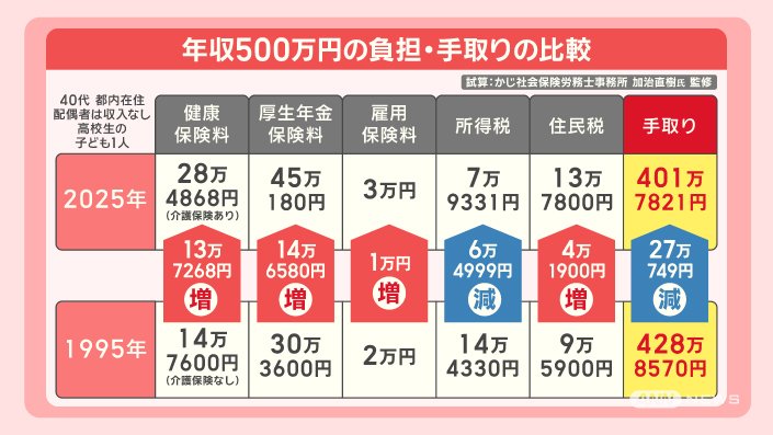 結果、30年前と比べると、手取りは428万8570円だったのが、401万7821円になり、27万749円減りました。