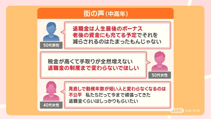 「税金が高くて手取りが全然増えない。退職金の制度まで変わらないでほしい」