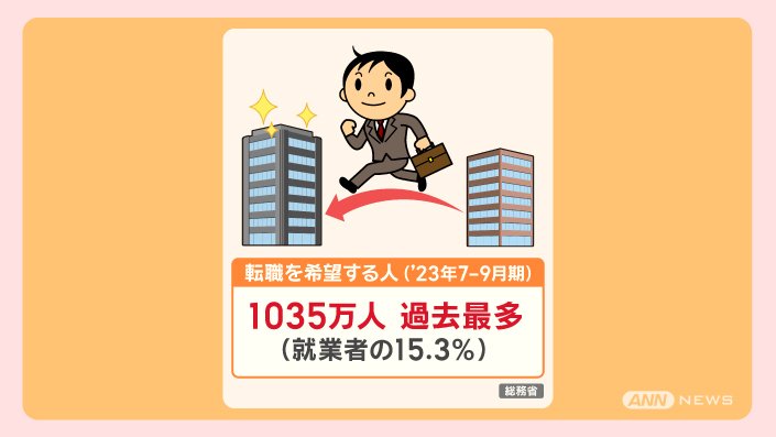 転職希望者は、調査した2023年の7月から9月の3カ月で1035万人と過去最多、就業者の15.3%です。