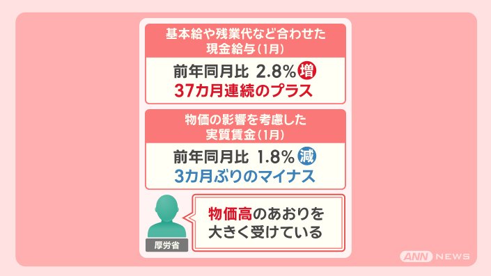 基本給や残業代などを合わせた1月の現金給与は、1年前と比べて2.8%増加、37カ月連続のプラスとなりました。