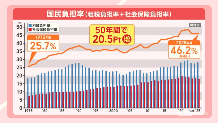 1975年の国民負担率25.7%と比較すると、50年で20.5ポイント増加しています。