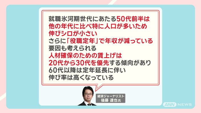 「就職氷河期世代にあたる50代前半は、他の年代に比べ特に人口が多いため伸びシロが小さい。さらに『役職定年』で年収が減っている要因も考えられる。人材確保のための賃上げは、20代から30代を優先する傾向があり、60代以降は定年延長に伴い伸び率は高くなっている」