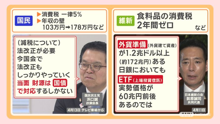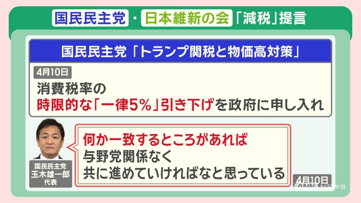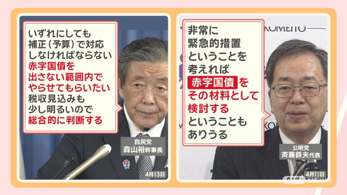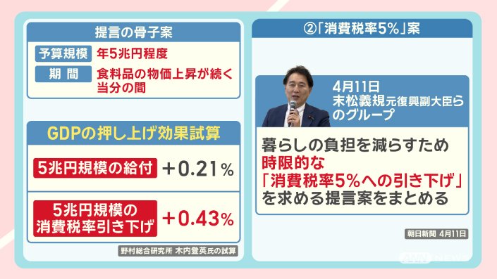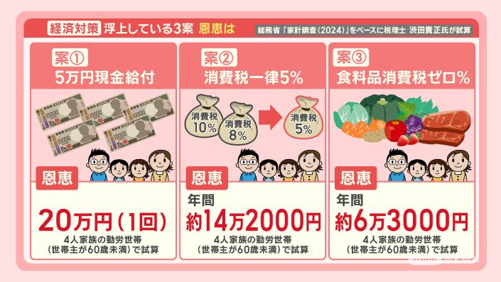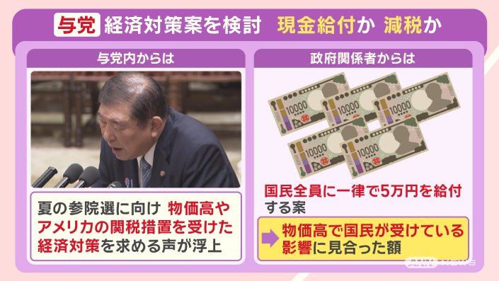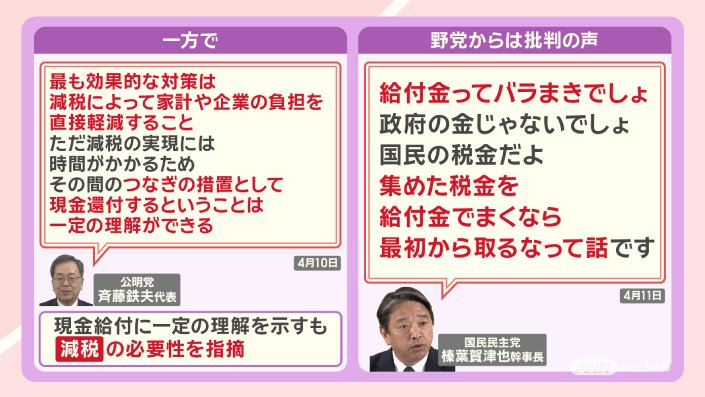 政治 モーニングショー 2025年4月16日 16:00 経済対策で現金給付?減税?商品券案も 恩恵を試算すると…でも財源はどこから? 2025年4月16日 16:00 広告 1■経済対策 給付&減税 3案が浮上 恩恵いくら?4人家族で試算 この記事の写真は15枚 ■現金給付か減税か コメやガソリンなどの商品券配布案も浮上 ■立憲民主から『減税』めぐる様々な案浮上 否定的な意見も ■国民・維新から消費減税求める声 ■経済対策 巨額予算の財源はどこから?各党の主張 (「羽鳥慎一モーニングショー」2025年4月15日放送分より) この記事の写真を見る(15枚) ・【ニュースをわかりやすく】TVerにて羽鳥パネル 見逃し配信中!・減税?給付?どうする経済対策…与党キーマンが「補正予算」明言・与野党から意見続出…物価高対策は給付or減税?・朝令暮改の「トランプ関税」 経済対策に“商品券”案浮上 ・総理周辺「減税はダメ。上げる時に何百倍のエネルギー必要」現金給付はバラマキ批判も スクープ投稿 トップ 政治 国政 記事