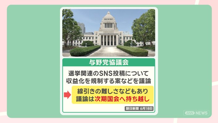 国会では、与野党の協議会で、選挙関連のSNS投稿について、収益化を規制する案などを議論しています。