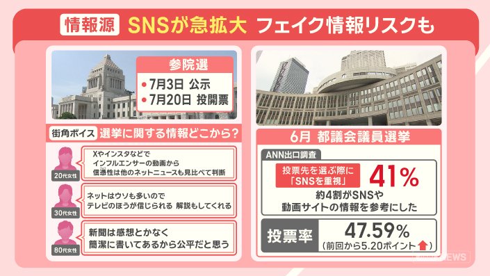 6月の都議会議員選挙では、ANNの出口調査で、投票先を選ぶ際にSNSの情報を重視したという人は41%でした。