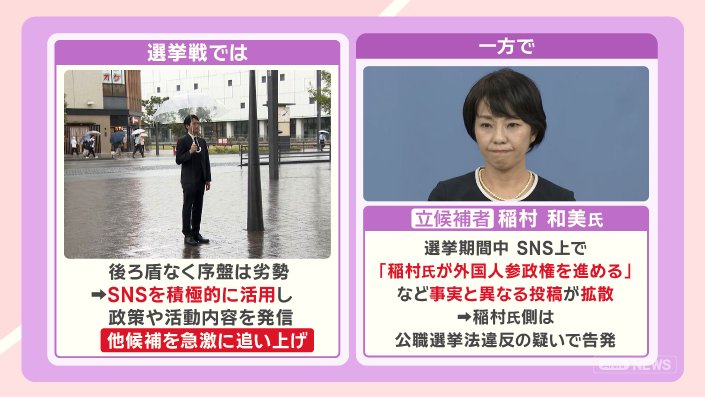 一方で、同じく立候補した稲村和美氏は、選挙期間中、SNS上で、『稲村氏が外国人参政権を認める』など事実と異なる投稿が拡散されました。