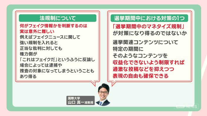 「『選挙期間中のマネタイズ規制』が、対策になり得るのではないか。選挙関連コンテンツについて、特定の期間にそのようなコンテンツを収益化できないよう制限すれば、過激な投稿などを抑えつつ、表現の自由も確保できる」ということです。