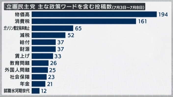 ANNでは、参議院選挙について、公示日から8日までの各党の候補者と政党公式のXのアカウントを対象に、どのような「政策」に関連するワードが投稿されているのか、分析ツールで調べました。