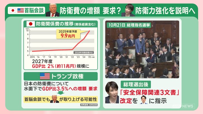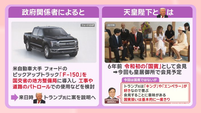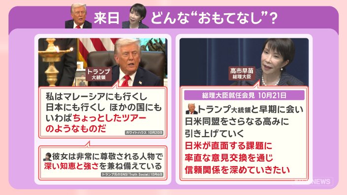 政治 モーニングショー 2025年10月23日 16:00 トランプ大統領 来日で初の日米首脳会談へ 高市流“おもてなし”はアメ車!? 広告 1■高市新内閣 支持率は60%超 自維連立の評価は? この記事の写真は11枚 ■トランプ氏 6年ぶり来日へ アメ車&金でおもてなし!? ■日米首脳会談で防衛費の増額要求?防衛力強化を説明へ (「羽鳥慎一モーニングショー」2025年10月23日放送分より) 広告 スクープ投稿 トップ 政治 外交・防衛 記事