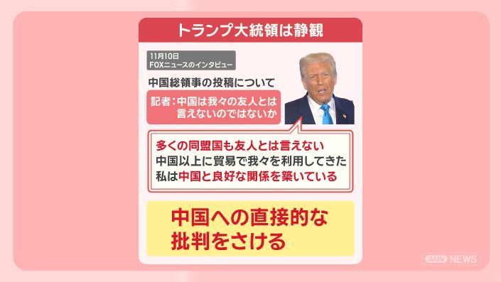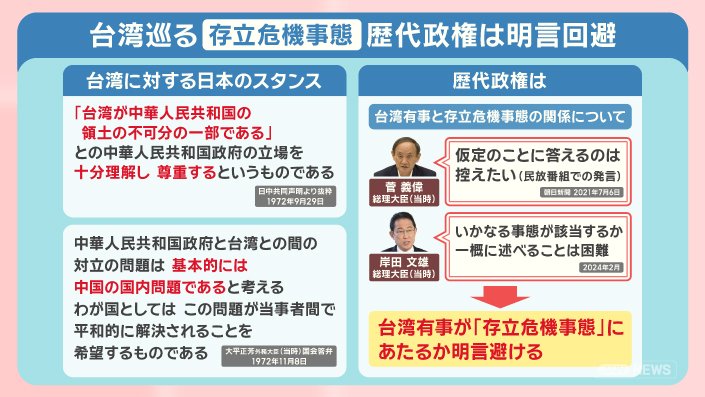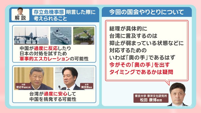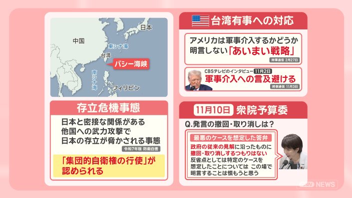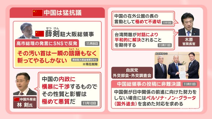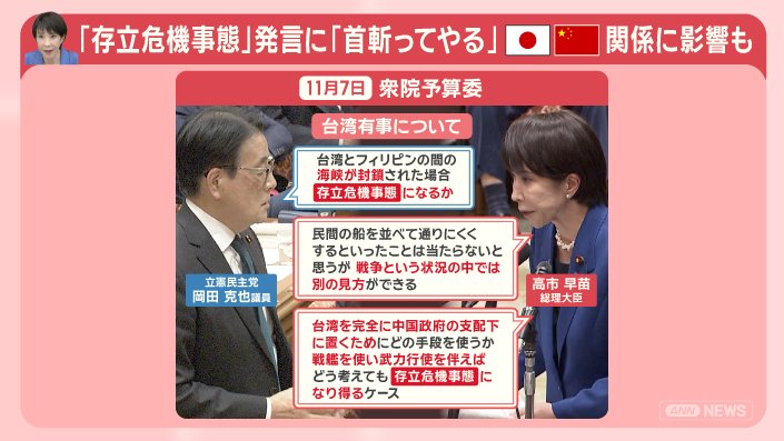 政治 モーニングショー 2025年11月14日 16:00 高市総理 台湾有事「存立危機事態」発言の波紋 中国猛反発 日中関係への影響は? 広告 1■高市氏発言 中国総領事「首斬ってやる」日本政府は抗議 この記事の写真は9枚 ■台湾巡る「存立危機事態」歴代政権は“あいまい”に ■台湾の海上封鎖 米国の想定 軍事衝突で日本への影響も? (「羽鳥慎一モーニングショー」2025年11月13日放送分より) 広告 スクープ投稿 トップ 政治 記事