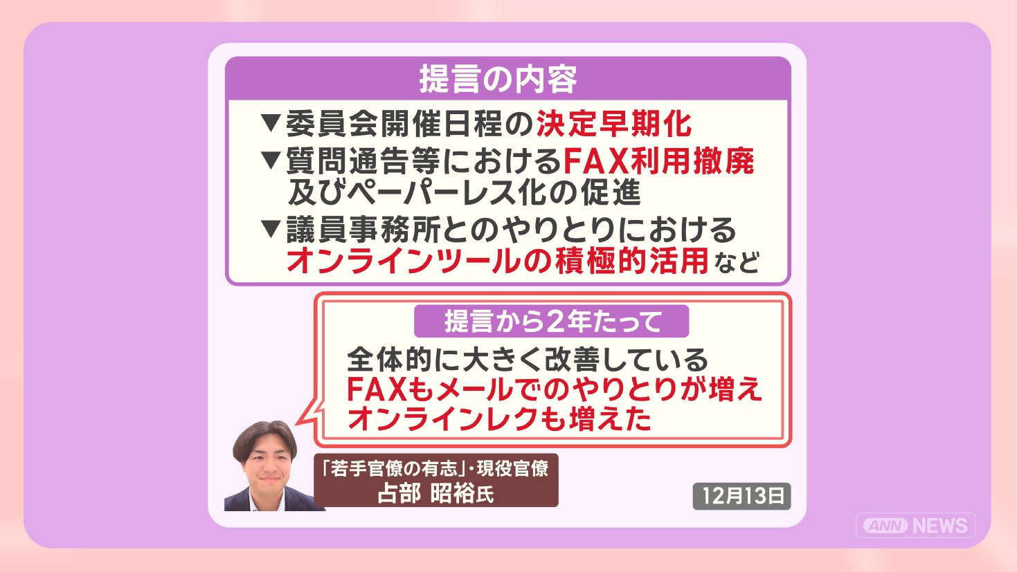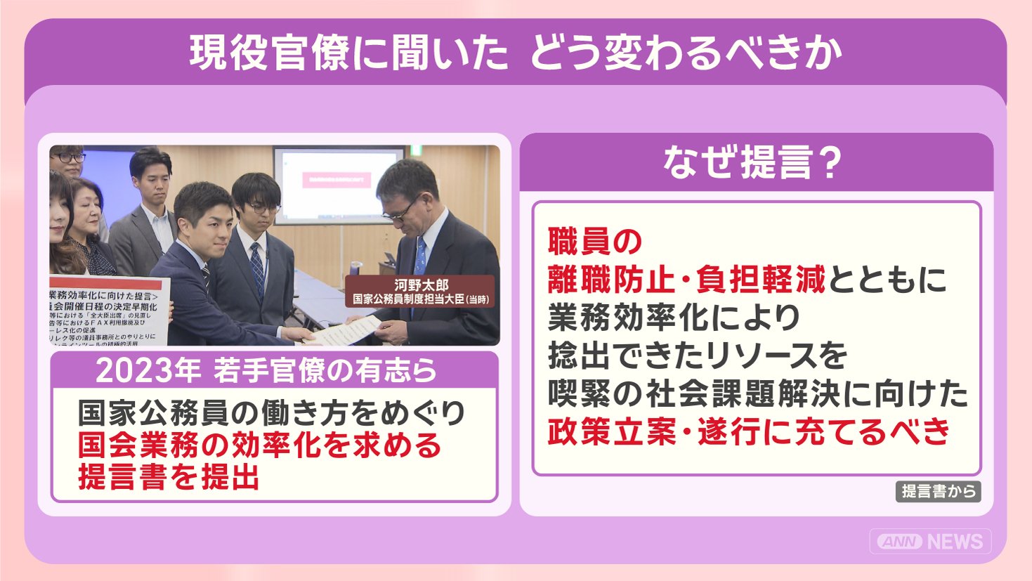 2023年、若手官僚の有志らは国家公務員の働き方をめぐって、国会業務の効率化を求める提言書を当時の河野国家公務員制度担当大臣に提出しました。