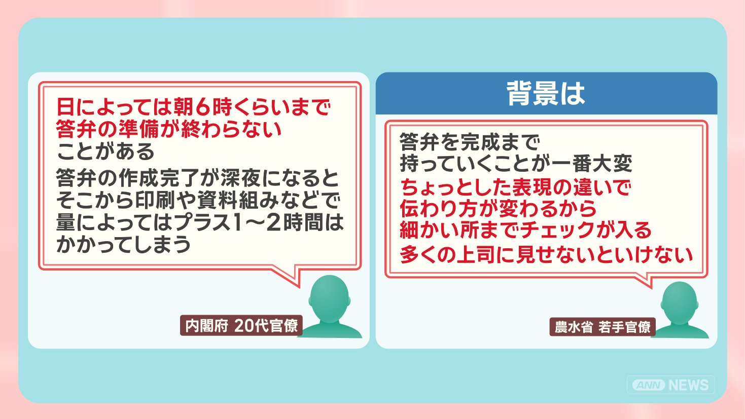 「日によっては朝6時くらいまで答弁の準備が終わらないことがある。答弁の作成完了が深夜になるとそこから印刷や資料組みなどで、量によってはプラス1〜2時間はかかってしまう」