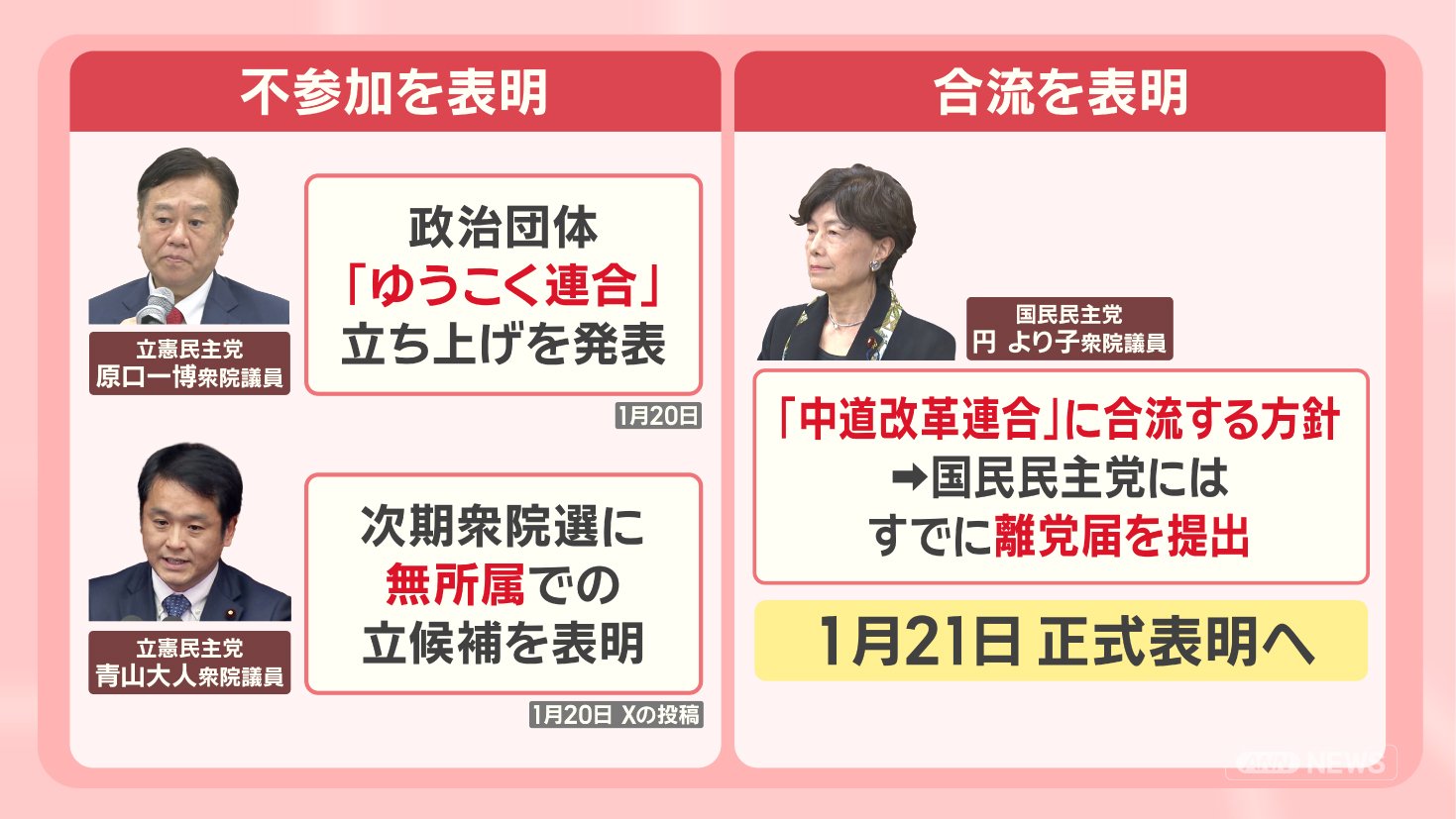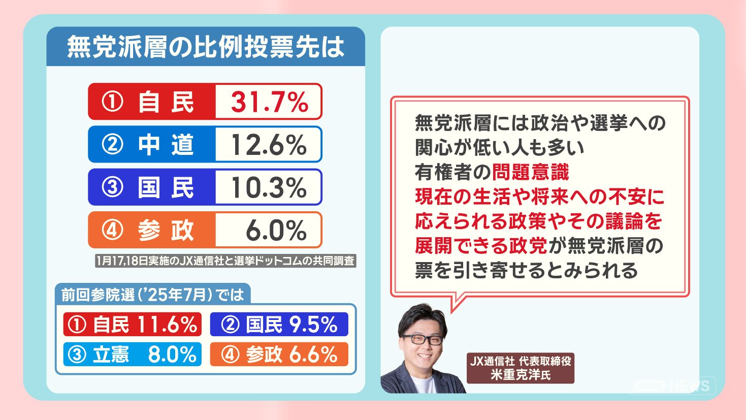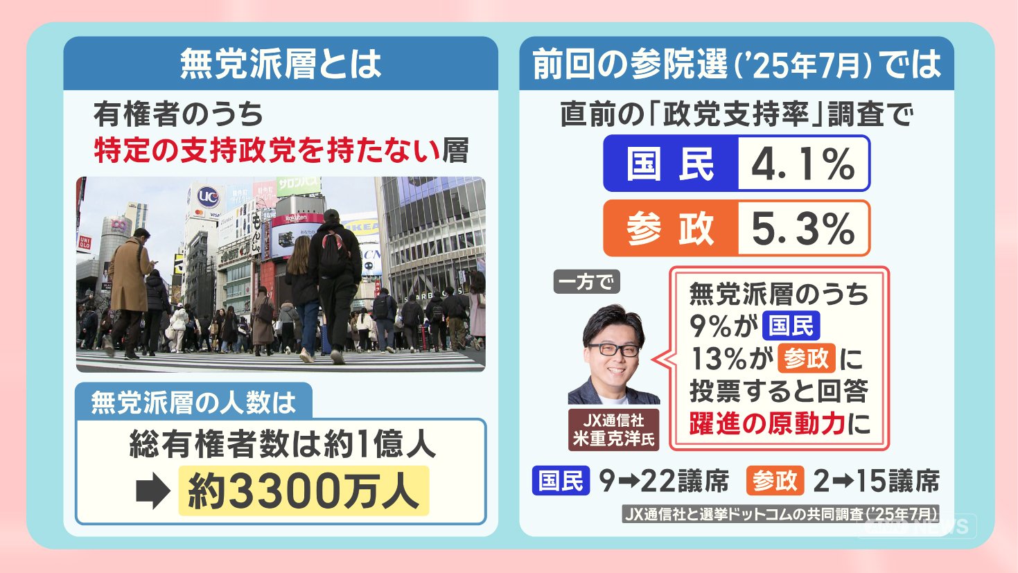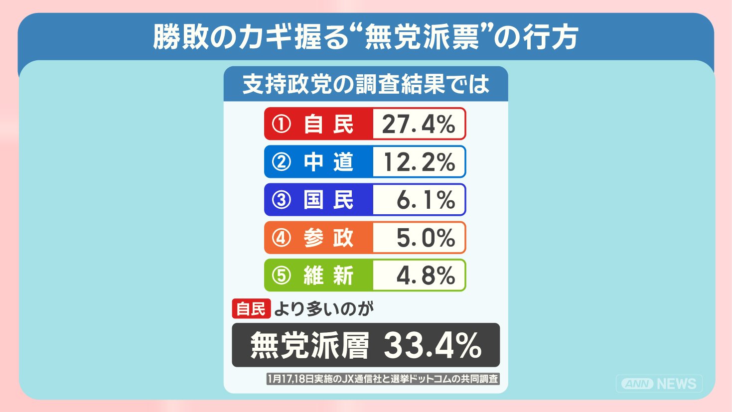 政治 モーニングショー 2026年1月21日 16:00 高市内閣『解散判断』支持率に影響?勝敗のカギは“無党派層”最新調査から見る衆院選 広告 1■新党『中道』立憲から180人 一部不参加 国民からは合流も この記事の写真は14枚 ■高市内閣初の支持率下落 最新調査「物価高対策」を重視 ■勝敗のカギは“無党派層” 前回衆院選では「躍進の原動力」 ■衆院選 何を訴える?各党の主張 (「羽鳥慎一モーニングショー」2026年1月21日放送分より) 広告 スクープ投稿 トップ 政治 選挙 記事