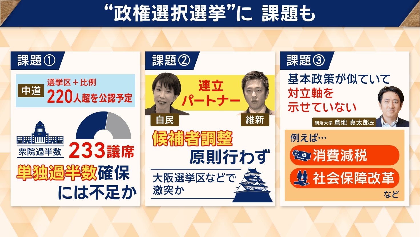 さらに、明治大学・准教授の倉地真太郎さんは、「与野党ともに基本政策が似ていて、対立軸を示せていない」と指摘する。例えば、消費減税や社会保障改革など、重要な政策で独自色を出せていないという。