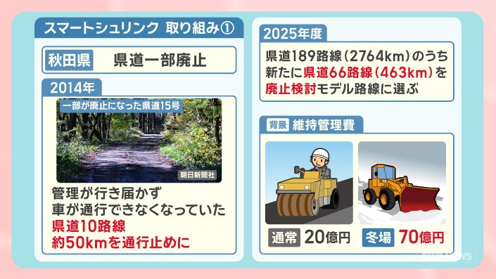 さらに2025年度、県道189路線(2764キロ)のうち、新たに県道66路線(463キロ)を廃止検討モデル路線に選びました。